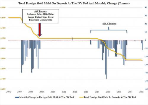 As a result, according to the latest Fed data, the amount of physical gold stored at the NY Fed has dropped to the lowest on record, or 7.819 thousand tons, following a withdrawal scramble that started in 2014 and continued until the end of 2016. After a 15 month hiatus, withdrawals resumed in 2018, with 15.5 tons of gold repatriated in January and February.