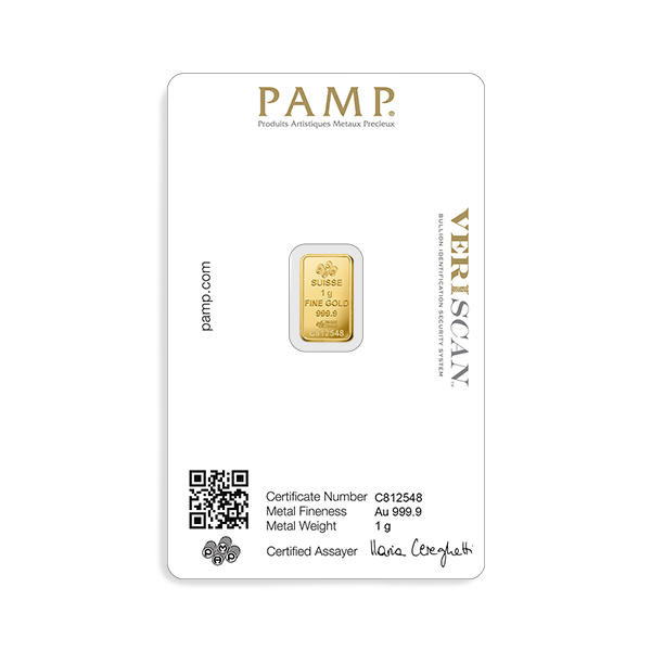 On the obverse, the bar features the PAMP logo, the inscription “Suisse”, the weight “1 g”, the metal “Fine Gold”, the purity “999.9”, the assayer’s mark, and a unique serial number guaranteeing authenticity and full traceability.