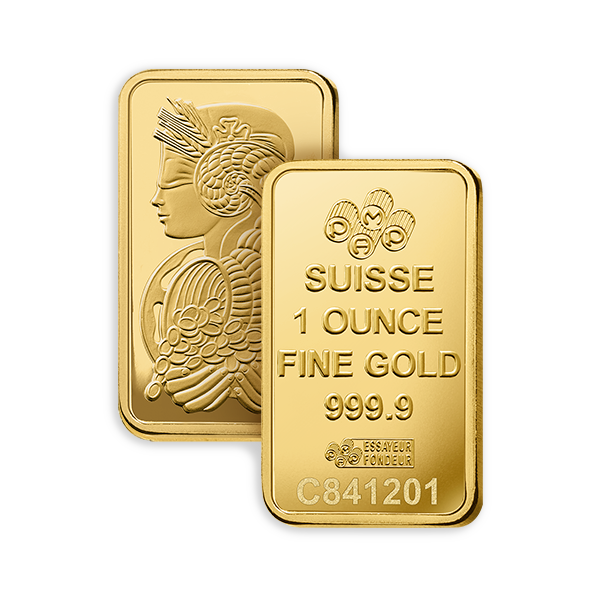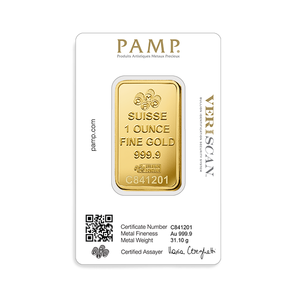 On the obverse, the bar features the PAMP logo, the inscription “Suisse”, the weight “1 ounce”, the metal “Fine Gold”, the purity “999.9”, the official assayer’s mark, and a unique serial number ensuring authenticity and full traceability.