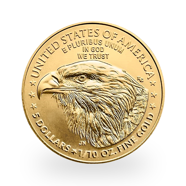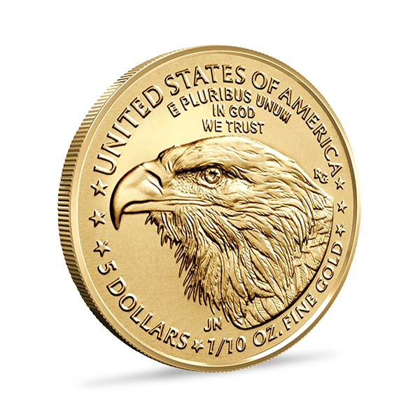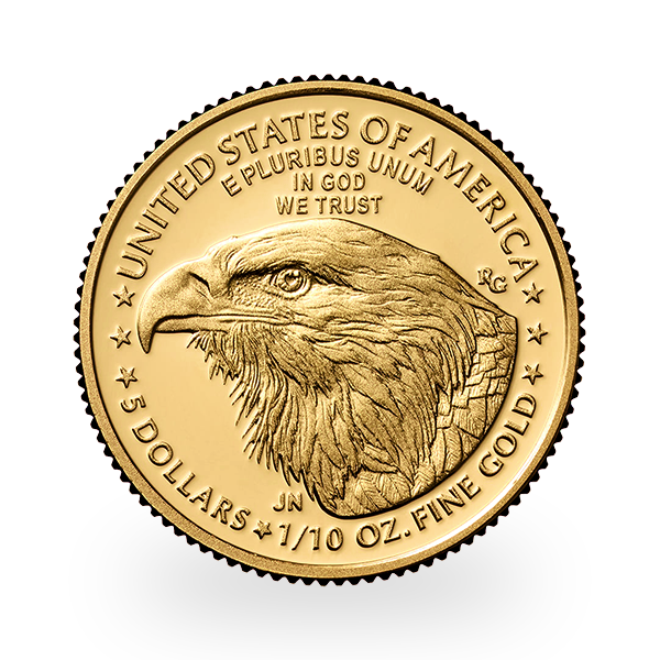 On the reverse, the coin presents the bald eagle, the emblematic national symbol of the United States. Surrounding the design are the inscriptions "UNITED STATES OF AMERICA", "E PLURIBUS UNUM" ("Out of many one"), "IN GOD WE TRUST", along with the denomination "5 DOLLARS" and the specification "1/10 OZ. FINE GOLD".