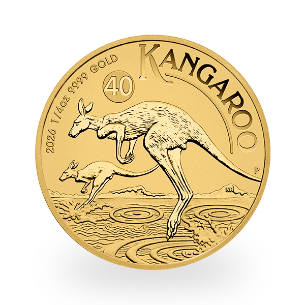 The reverse of the 2026 1/4 oz Kangaroo depicts two kangaroos leaping across the water, set against a mountainous landscape. The number "40" pays tribute to the 40th anniversary of the Australian Nugget, the first official Australian legal tender gold coin series. The design includes the inscription "KANGAROO", the Perth Mint’s "P" mintmark, as well as the inscriptions "1/4 oz", "9999", "GOLD", and the year-date "2026".