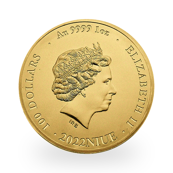 The reverse depicts Her Majesty Queen Elizabeth II, marking her 70th year on the throne. This is the fourth definitive portrait of the Queen, originally created in 1998 by sculptor Ian Rank-Broadley. The engraving shows a mature monarch wearing the Queen Mary button stud pearl earrings and the Girls of Great Britain and Ireland tiara. As usual, the face value (100 Niue dollars) and the gold purity (.9999) also appear on this side.