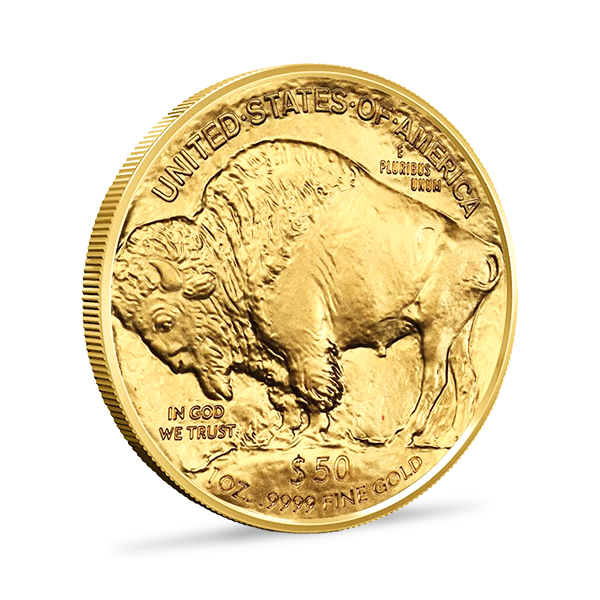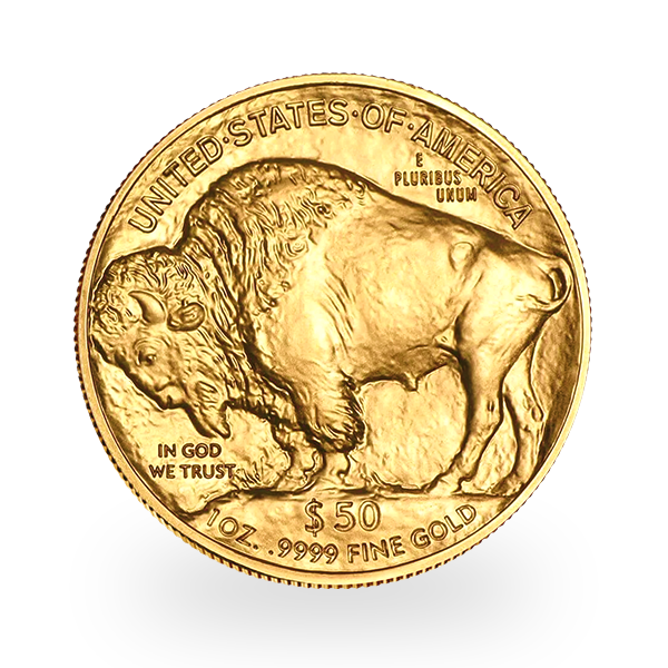 The reverse displays the majestic American Buffalo — or bison — standing atop a mound of earth. Surrounding it are the inscriptions “UNITED STATES OF AMERICA”, “E PLURIBUS UNUM” (“Out of many, one”), “IN GOD WE TRUST”, along with the denomination “$50”, the weight “1 OZ” and the purity “.9999 FINE GOLD”.