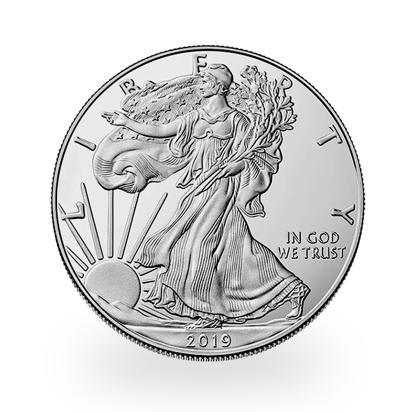 The obverse features Adolph A. Weinman’s full-length figure of Liberty in full stride, draped in an American flag with her right hand extended; In her left hand, she holds branches of laurel and oak, symbolizing America’s civic and military greatness. The word LIBERTY rounds the top half of the coin, 2019 the bottom, and IN GOD WE TRUST is situated to the right.