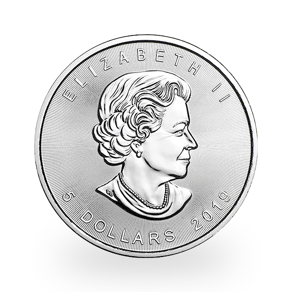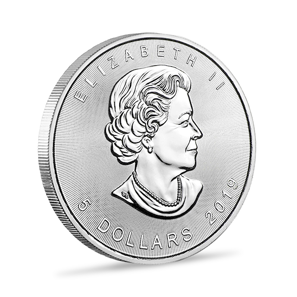 The reverse features a Maple leaf, national symbol of Canada since the 18th century, surrounded by the words CANADA, FINE SILVER 1 OZ ARGENT PUR and 9999 on either side. To the right, a micro-laser engraved maple leaf privy contains the numeral 19, denoting the coin's year of issue.