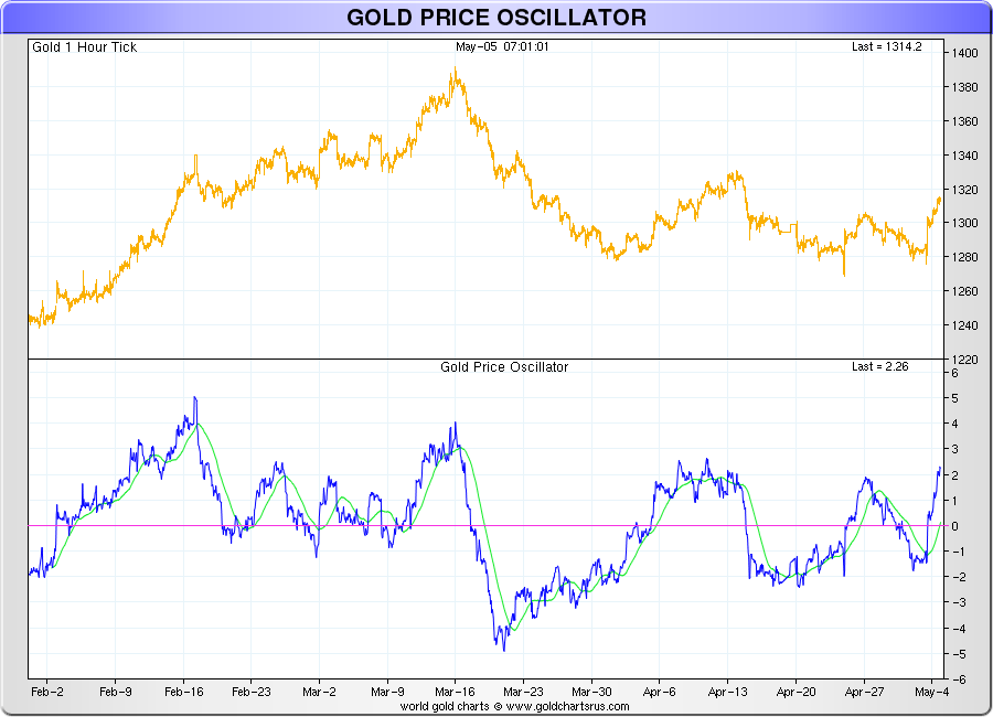 The intraday oscillator for gold is about to break out of it's pattern which along with gold's bottoming will show a strong breakout. This bodes well for the bottom in gold having been put in place & is another sign of it happening.