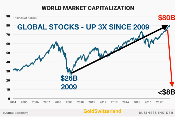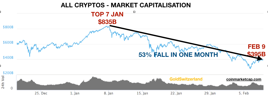 The fall in Cryptos is symptomatic of the end of an era. Compared to $80 trillion global stock markets, cryptos are insignificant. Stocks and cryptos have one thing in common, they both have a long way down from here. Whilst cryptos will go to zero, stocks will go down in real terms by at least 90%. I say real terms because hyperinflation can take the nominal level of stocks a lot higher. Between 1929 and 1932 the Dow fell by 90%. On any criteria, the stock bubble is so much greater today so once this market has topped, the coming fall will shock the world.
