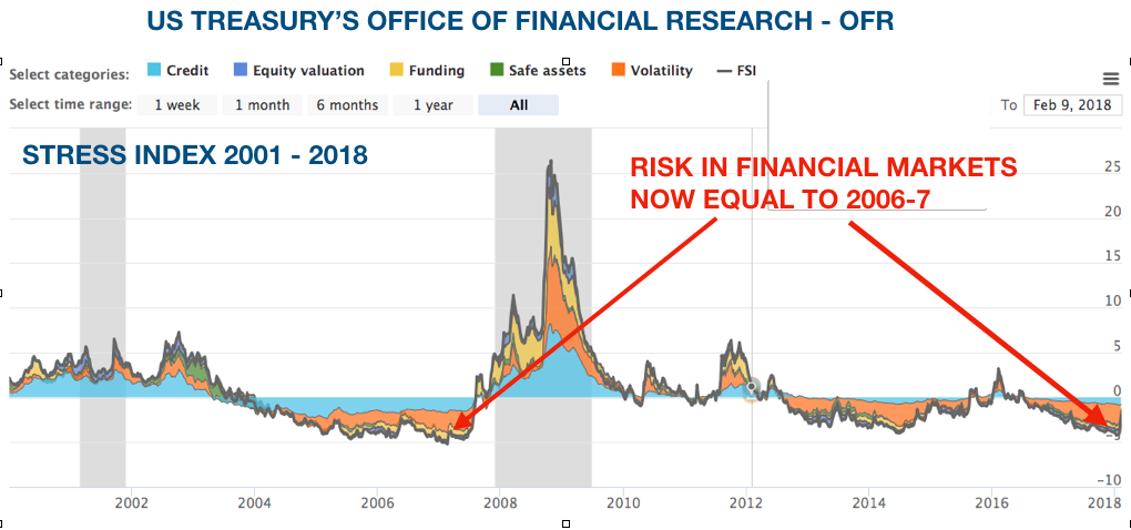 The OFR Stress Index below is a daily market based snapshot of stress in global financial markets. It is constructed from 33 financial market variables such as yield spreads, valuation and interest rates. The index is now at a similar risk level as before the 2007- 9 financial crisis.