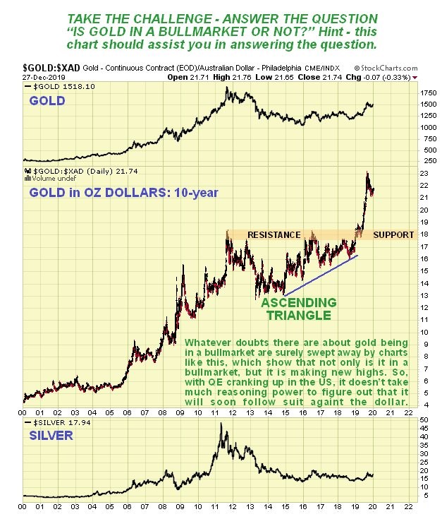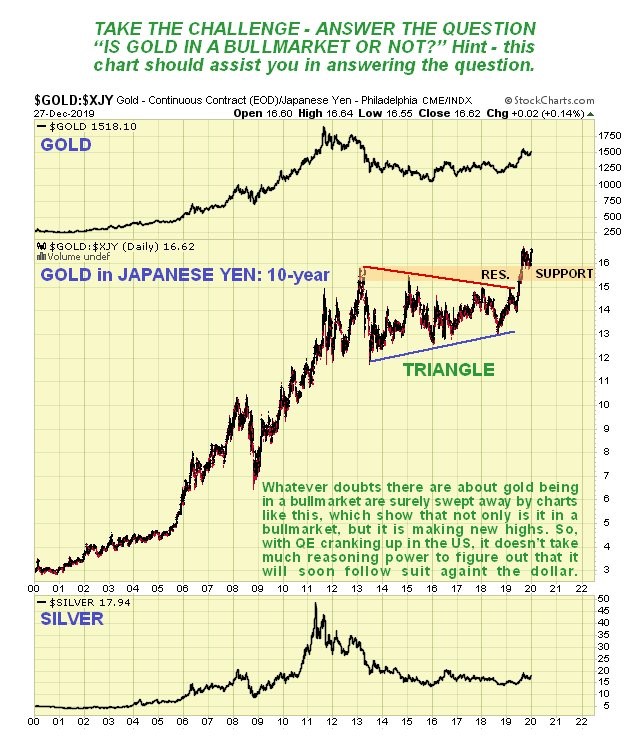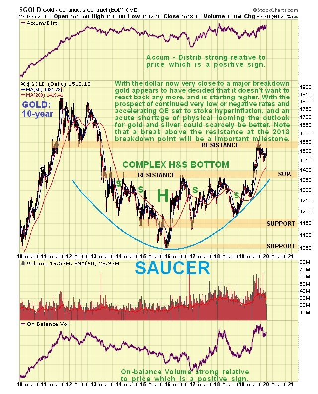 There is a broad array of fundamental reasons for a bullmarket of unprecedented magnitude in gold, but by far the most important of them is the ongoing and accelerating destruction of currencies by Central Banks. They are responding to crushing debt burdens with money creation on a gargantuan scale, and we can expect them to maintain a low or negative interest rate environment and to pump money like crazy, since faced with a choice between a liquidity lockup and systemic implosion, and rampant money creation leading to hyperinflation, they are bound to follow the latter course because it is more gradual and buys them more time. While all Central Banks around the world are playing the same game, they will find it very hard to keep up with the Federal Reserve of the US which is ramping up money creation at a frenetic pace, the effect of which will be to collapse the dollar, which is already starting to break down – hence last week’s rally in gold and silver.