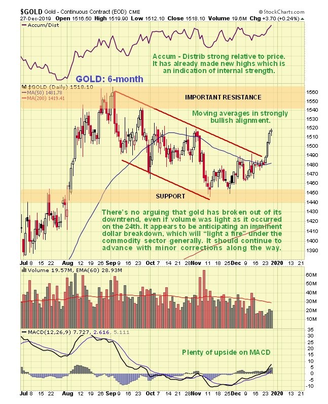 On the latest 6-month chart we can see recent action in detail, and how gold broke out of its intermediate downtrend from the September peak early last week on of all days, Christmas Eve. I have had some mails from people wondering if, because this breakout occurred on low volume on such a day, it makes it invalid. I don’t think it does and here’s why - while many ordinary investors are rushing around like headless chickens in the lead up to Christmas doing late present buying etc, Big Money is probably much more calm and collected. The reason for this is that they sent Jeeves to do most of the present buying in the sales back last January, and he probably had an assistant to keep driving the limo round the block for perhaps several hours before he emerged with a trolleyload of presents. Don’t laugh - this is what the wealthy used to do when they shopped at Harrods in London, where parking was almost impossible. The point is that buying around this time is more likely to be Big Money, and we saw an example of it with the dramatic reversal in the stockmarket around Christmas last year, so, light volume or not, this breakout looks like the real thing.