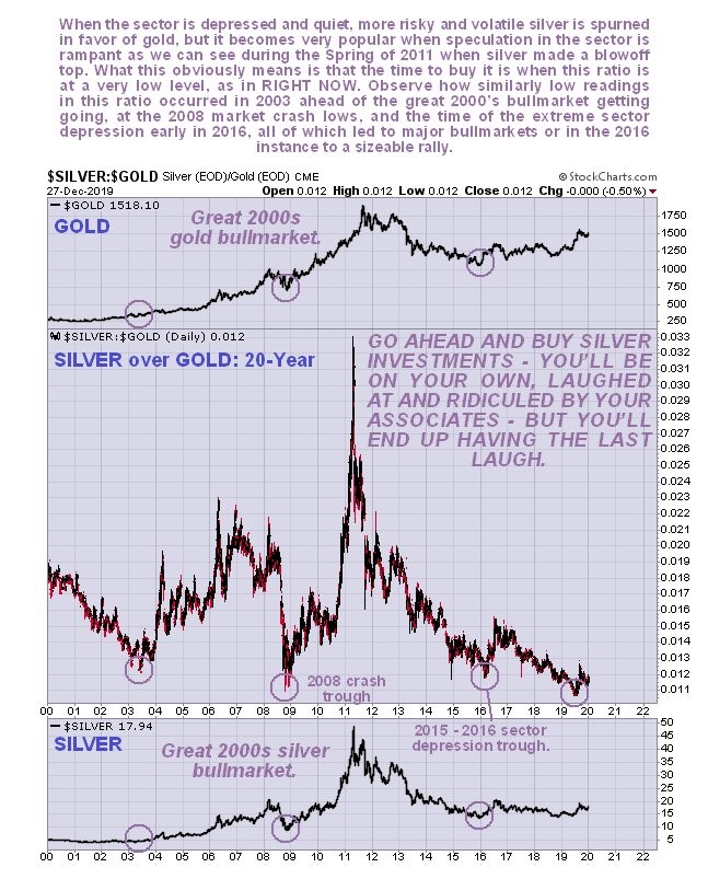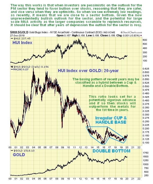 Lastly, the HUI GoldBUGS index to gold ratio likewise shows that the sector is still very close to long-term cyclical lows with this ratio having formed a giant base pattern that may be classified either as a Double Bottom or as an irregular Cup & Handle base, as we see on its 20-year chart below. The psychology behind this is simple and is as follows – when investors are fearful and negatively disposed towards the PM sector, they favor bullion over stocks, because they reason that it is a lot safer, which is of course true, and so at these times stocks are cheap relative to bullion, while at tops the reverse is true with speculation rampant in stocks, which are favored over bullion. With this ratio still at a very low level, but starting to emerge from a giant base pattern, this looks like an excellent time to go overweight in this sector.