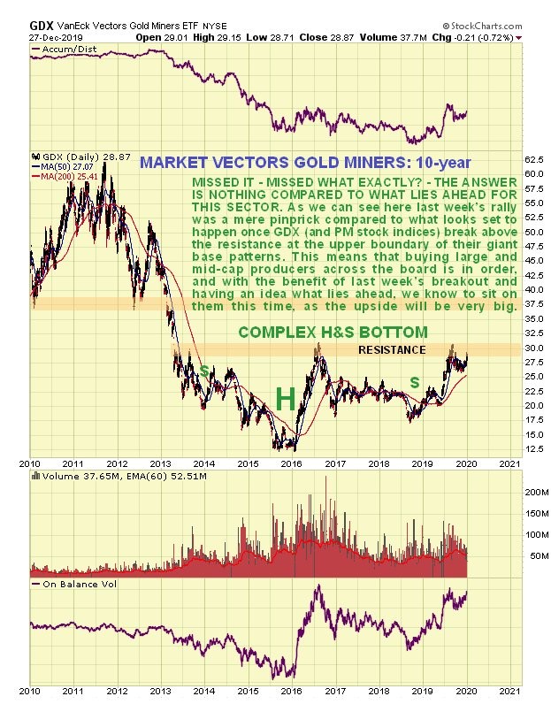 With the outlook for gold and silver now so favorable, it should come as no surprise that the charts for PM stocks are shaping up very well indeed – and the good news is that the real big action hasn’t even started yet, as we will now see on the latest 10-year chart for GDX. In response to one or two accusatory Emails I have received in recent days along the lines if “You missed it – you missed the breakout!” my response is yes, we did, but we aren’t worried because the upcoming bullmarket in this sector is going to be so massive that we can afford to wait for it to “tip its hand” before we go all in – the rally of the past few days is a mere pinprick compared to what lies ahead. The main point to observe on the chart below is that GDX still hasn’t broken out of the giant complex Head-and-Shoulders bottom that has been forming since 2013, whose upper boundary is the zone of resistance around the $30 level, but it looks like it is very close to doing so, and once it does we can expect it to accelerate to the upside. While there is resistance on the way up, it is not hard to understand that with gold set to advance in the not too distant future to the $3000 - $4000 area, GDX should have little trouble working its way through the resistance approaching earlier peaks and breaking out to new highs.