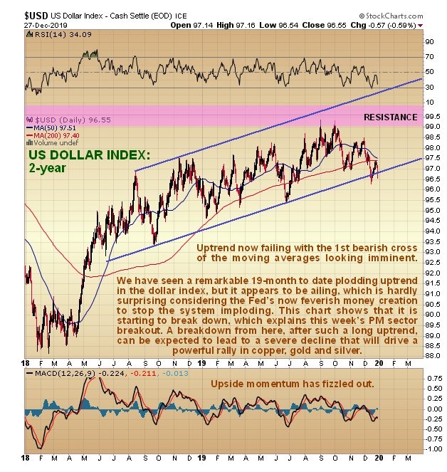 Now we come to the real concrete reason for gold and silver breaking out last week, the ailing dollar. Faced with a full frontal assault on it by the Federal Reserve printing money like crazy in a manner that no other Central Bank can hope to keep up with, the dollar is at last buckling under the strain and breaking down, as we can see on the latest 2-year chart for the dollar index shown below. Given that it is breaking down from a long shallow ponderous uptrend that has been going on for about 20 months, this is viewed as a major development that could lead to a rapid and severe decline, especially as a so called “death cross” looks imminent, where the 50-day moving average crosses below the 200-day. The last time this happened was early in 2017, and that lead to a big drop.