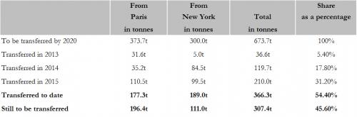 As a reminder, according to its gold storage plan, unveiled in January 2013, the Bundesbank would store half of Germany's gold reserves in its own vaults in Frankfurt am Main by 2020 which would necessitate a transfer to Frankfurt of 300 tonnes of gold from New York and all 374 tonnes of gold from Paris. It also meant that as of January, another 111 tonnes of gold from the NY Fed and 196.4 tonnes of gold from Paris remained to be transfered.