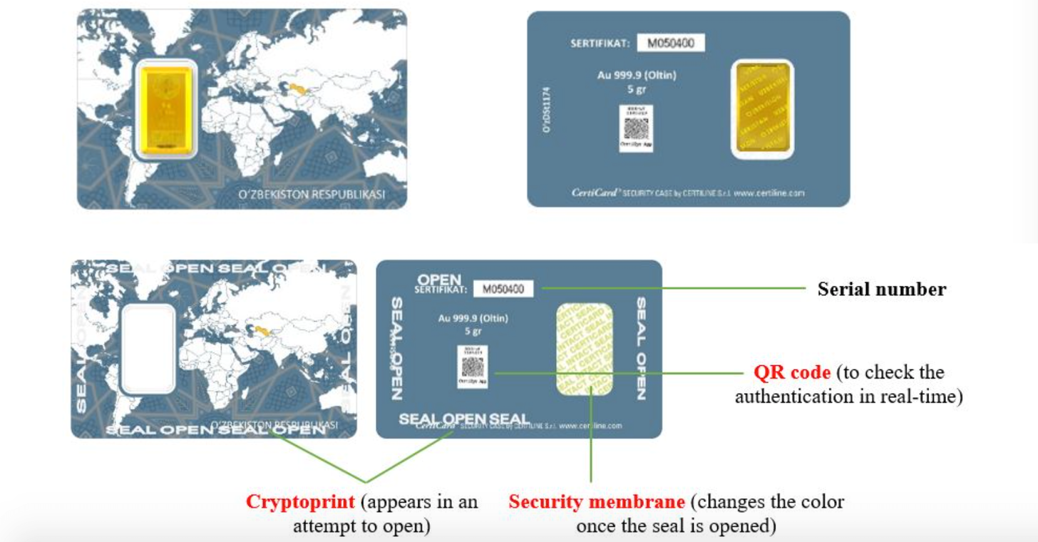 Since November 2020, the central bank of Uzbekistan (CBU) issues sealed gold bars with a QR-code for real time verification. With these new bars CBU aims to stimulate gold to be used as a store of value, as well as promote the circulation of gold.