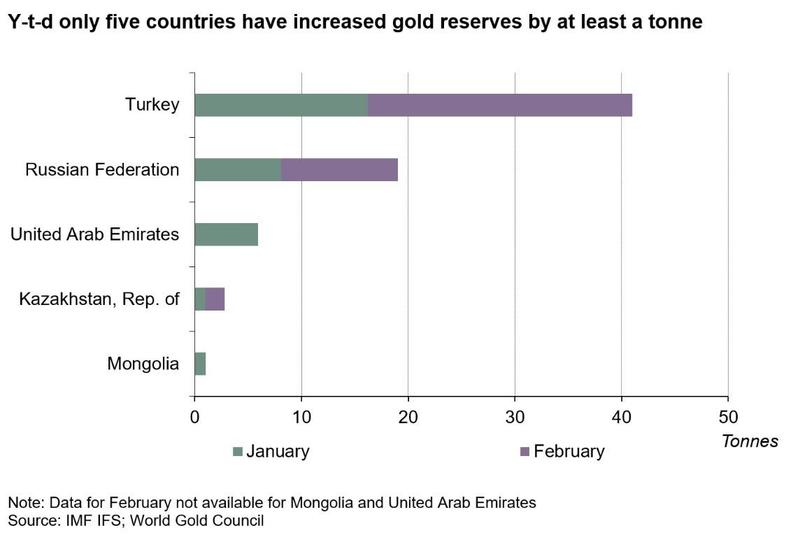 Turkey continued to be the biggest gold-buyer. The Turks added another 24.8 tons to their reserves in February.