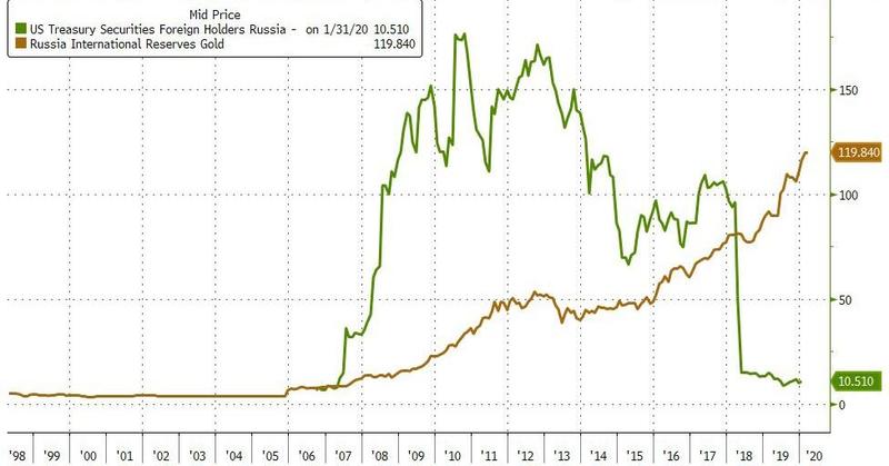 The Russians have been buying gold for the last several years in an effort to diversify away from the US dollar. Russian gold reserves increased 274.3 tons in 2018, marking the fourth consecutive year of plus-200 ton growth. Meanwhile, the Russians sold off nearly all of its US Treasury holdings. According to Bank of America analysts, the amount of US dollars in Russian reserves fell from 46% to 22% in 2018.