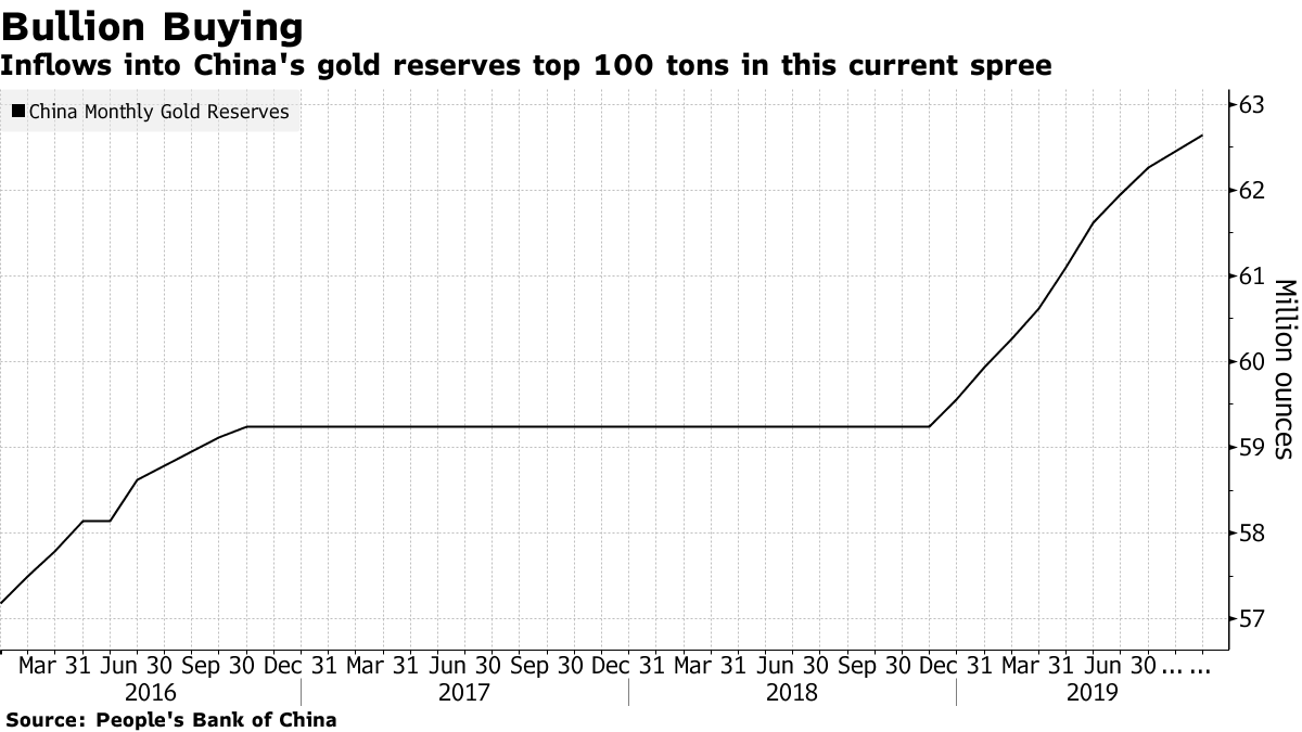 The PBOC’s run of bullion-buying has come against the challenging backdrop of the trade war with the U.S. and a marked slowdown in growth at home. While high-level negotiations are set to resume in Washington this week, Chinese officials are signaling they’re increasingly reluctant to agree to a broad deal.