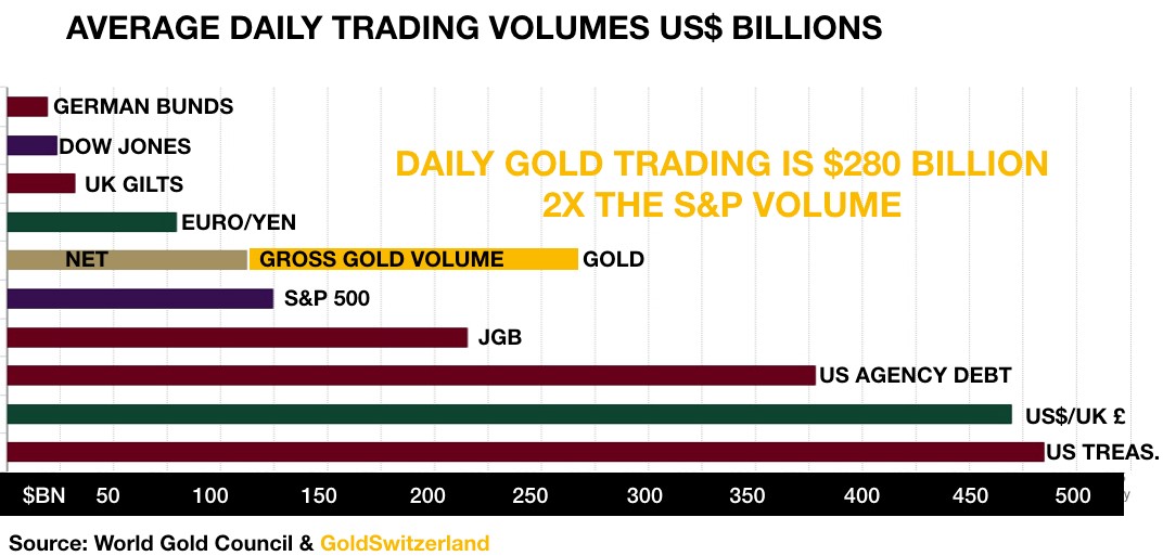 Of all the manipulated markets, gold might be the worst of them all. Investment gold represents less than 0.5% of world financial assets. Why then one might ask are daily traded gross gold volumes over 2x the S&P 500 volumes. According to the World Gold Council, gross traded daily gold volume is US$280 billion. The daily S&P volume is $125 billion.