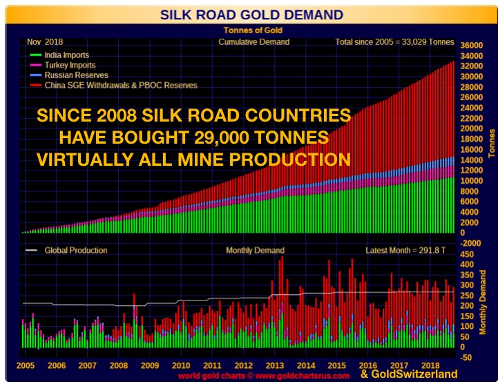 The official Central Bank gold reserves are around 32,000 tonnes. This figure probably understates the holdings of many Eastern countries like China. The gold buying of the Silk Road countries China, India, Turkey and Russia is relentless. Since 2005 they have bought 33,000 tonnes. The buying accelerated in 2008 and since then they have bought 29,000 tonnes. This means that in the last 11 years, these Silk Road countries have bought virtually the total gold production every year.