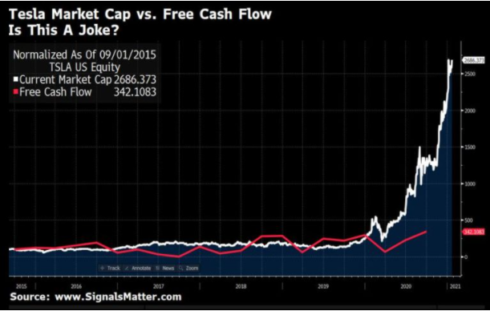 It’s a bubble asset for the ages, and whatever logical defense Tesla bulls might have for its “growth potential,” the screaming disconnect between its cash flow and share price once again proves Hussman’s warning that valuation still matters.