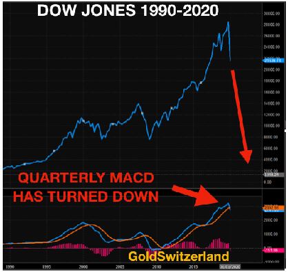 In the Dow for example, we have just seen on the quarterly chart, a downturn in the MACD indicator from a very high level. This is a very important trending signal which indicates that we are likely to see at least 10 years downtrend in stock markets. The alternative is that we will see a very rapid decline in the next 6-24 months and then the index going along the bottom for a decade or more.