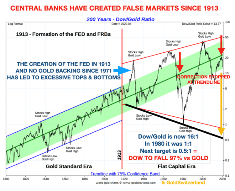 Since these kind of moves very often overshoot, we could easily see a Dow/Gold ratio of 0.2 to 1 which would mean a 99% fall of the ratio from today.