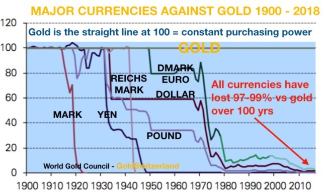 What most investors fail to understand is that governments are their best friend when it comes to gold. Because governments always underwrite the gold price by constantly printing money and expanding credit. That is why all currencies have fallen 97-99% against gold in the last 100 years. Thus, there is only 1-3% left for paper money to lose all their value.