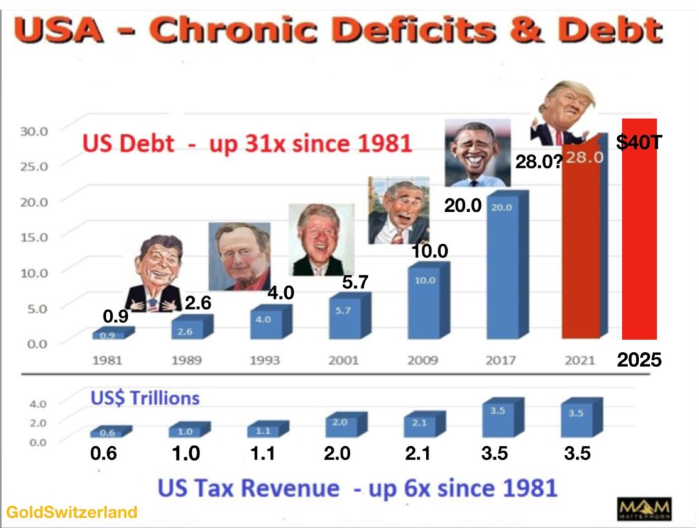 With US debt at $40t in 2025 and interest rates at say 15%, total interest cost would be $6t. Tax revenues are unlikely to rise from current levels and will be maximum $3.5t. Thus, just interest costs will be $2.5t above tax revenues. And so the vicious circle begins with falling tax revenues and rising costs, more deficits, corporate and bank defaults, debt levels exploding and interest rates surging. With risk levels at extremes, any lender would demand extremely high returns.
