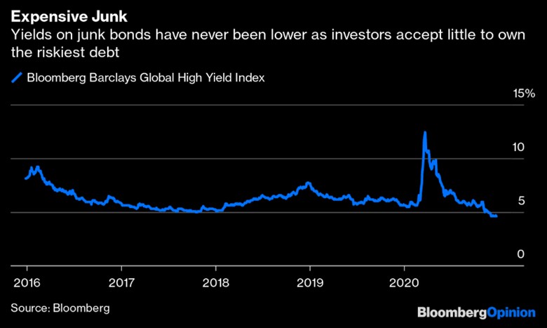 That is, global bonds yield next to zilch, which means investors are going further and further out on the risk branch on a drunken quest for yield in a credit market that otherwise has no yield, save for the junkiest and riskiest of bond peddlers.