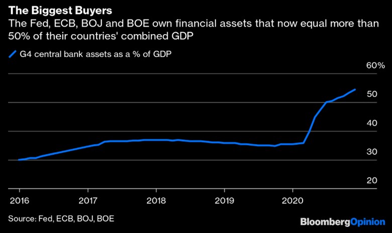Taken as a whole, the balance sheet assets of the Federal Reserve, the European Central Bank, the Bank of Japan and the Bank of England are now above 54% of their countries’ total GDP.