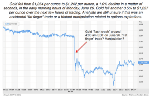 In the early morning hours of Monday, June 26, gold fell about 1%, from $1,254 per ounce to $1,242 per ounce, in a matter of seconds.