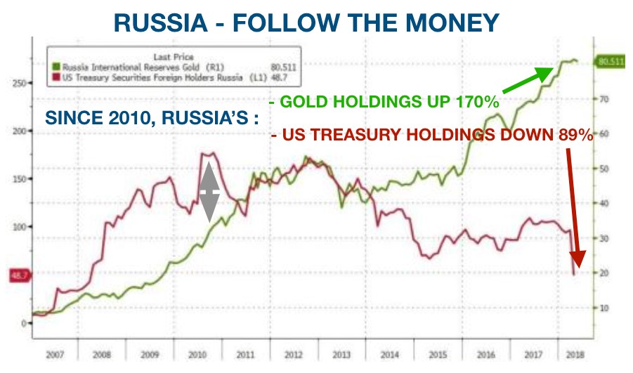 From insignificant gold holdings in 2007, Russia today has $80 billion of gold. And since 2010, Russia’s US treasury holdings have gone down by 89% to $20 billion today.