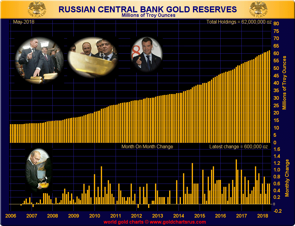 In May 2018 Russia added another 600,000 oz or almost 20 tonnes to its gold reserves. Since January 2018, when Trump became president, US debt has increased by 6% or $1.1 trillion to $21.1 trillion whilst Russia has added another 9 million oz of gold and are now holding $80 billion of gold reserves.