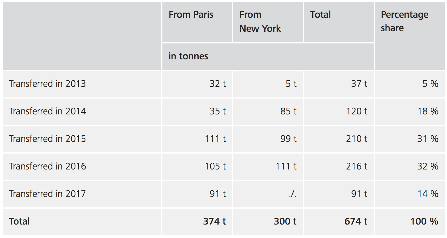 On January 16, 2013, the Bundesbank - one of the biggest gold holder in the world, with 3,378 tonnes - shocked the world: out of the blue, the German central bank announced that by December 31, 2020, it intends to store half of Germany’s gold reserves in its own vaults in Frankfurt, up from only 31% at the time. The plan would mean repatriating a total of 674 tonnes of gold, 300 from the New York Fed's gold vault, and another 374 from the Bank of France. The transfer, the Bundesbank explained, was meant to "build trust and confidence domestically, and the ability to exchange gold for foreign currencies at gold trading centers abroad within a short space of time."