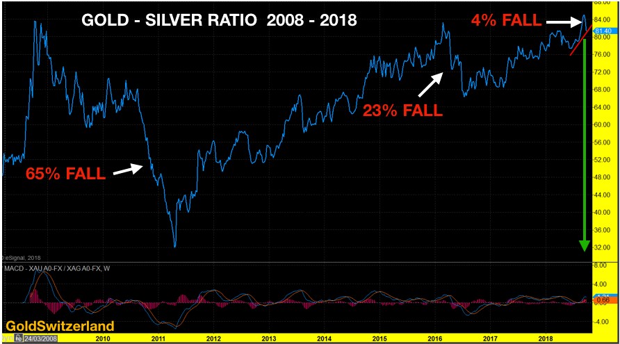 If we look at the Weekly chart of the Gold – Silver ratio below, it shows the 4% fall that has taken place in the last 10 trading days. In itself this fall might not seem significant. But the key is the reversal from a very important top area combined with bearish technical indicators. As the chart shows, this ratio can fall very fast once it starts, like the 65% fall in 2010-11 or the 23% fall in 2010.