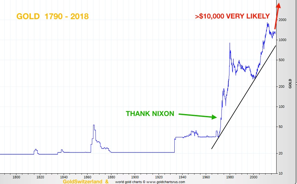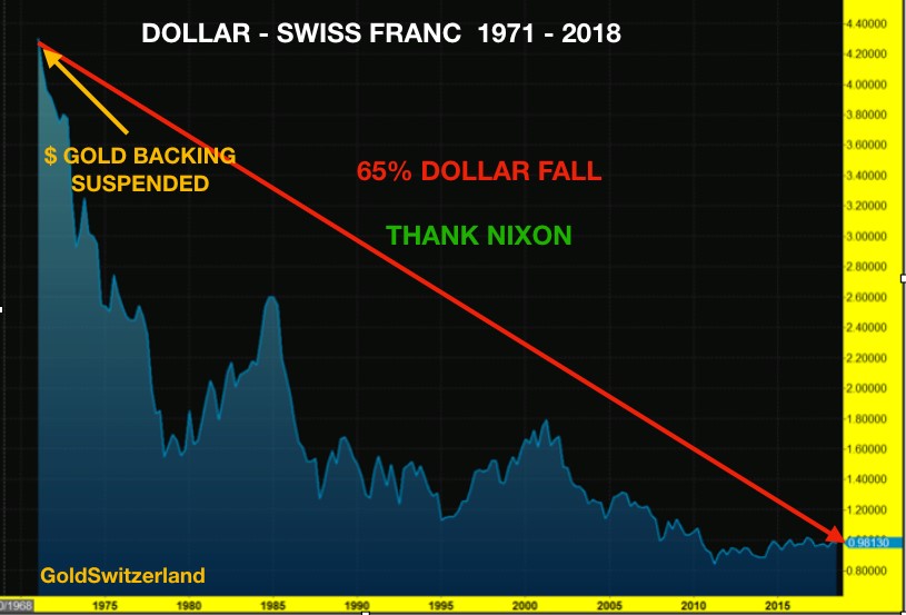 During this period, in August 1971, Nixon threw the dollar to the wolves by abandoning the gold backing of the greenback. That led to the dollar losing 96% against gold between 1970 and 1980. The dollar also lost massively against many currencies. Against the Swiss franc for example the dollar lost 65% between 1971 and 1979.