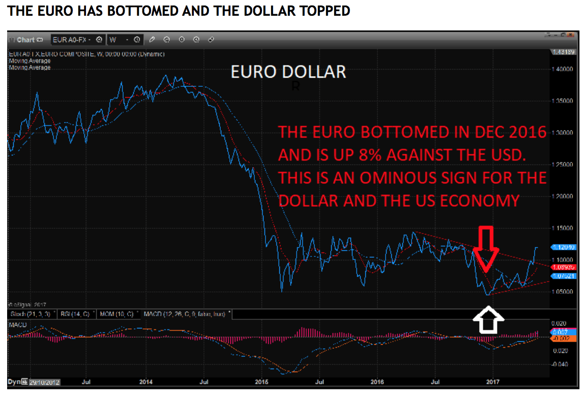 There are a few different signals I look at to time the turn of markets and when trouble will start in earnest. In my view, the US dollar is a leading indicator. The dollar, which is a bankrupt currency, will tell us when markets and the economy will turn. For years, all the “experts” have talked the Euro down and expected the dollar strength to continue. The Euro is of course a rubbish currency which is totally artificial and shouldn’t exists. On top of that the political and economic situation in Euroland is dire to say the least. But currencies are a relative game and the US has economic problems which are even greater than in Europe. The US is also the most debt laden country in the world. The dollar should have crashed long ago but the competition is so poor with badly managed economies around the globe so the dollar has held up due to its reserve currency status. But the dollar’s glory days are now coming to an end. It seems the dollar peaked back in December 2016 and that it is soon starting its journey down to the intrinsic value of zero.