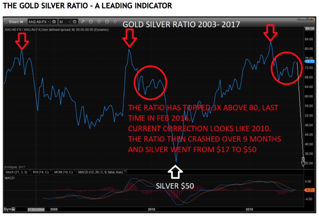 The other indicator that I watch carefully is the gold silver ratio. This ratio turned down in February 2016 from above the 80 level. This is the third time in the last 14 years that we see a turn at that level. After a peak in the ratio in 2008, the real collapse came in 2010-11 when the ratio crashed over a nine month period and silver surged from $17 to $50. The corrective pattern currently looks very similar to 2010 before the big fall in the ratio. When the gold / silver ratio turns down and falls strongly, this is a sign of very strong precious metals and a weak dollar. This is exactly what happened in 2010-11 as the ratio was collapsing.