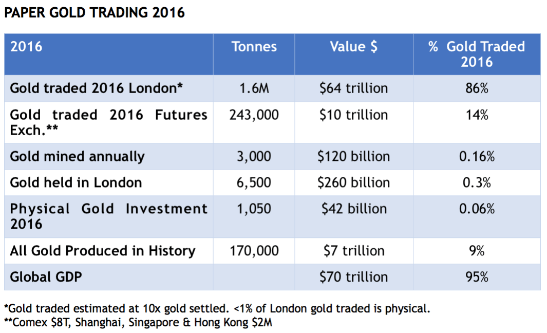 Governments and central banks currently have a very effective way of manipulating the gold price and this is the main reason why gold so far has not risen like Bitcoin. But in due course this will all change. If we look at the gold paper market, the amount of paper trading is astounding. In 2016, $10 trillion of paper gold was traded in four exchanges with Comex in New York accounting for 76% or of that. $10 trillion is more than all the gold ever produced in history which is $7 trillion. But the paper gold traded on the futures exchanges is totally dwarfed by the amount traded by the LBMA banks in London. In 2016, the total estimated gold traded in London is estimated at $64T. Of that less than 1% is physical. Adding the LBMA and Futures Exchanges gold trading we get to an astounding $74T annually. Thus, the world trades more paper gold than goods and services since global GDP is $70T. And the gold traded in 2016 is over 600x the gold mined every year. Even more incredible is that the paper gold traded was 10x all the gold ever produced in history.