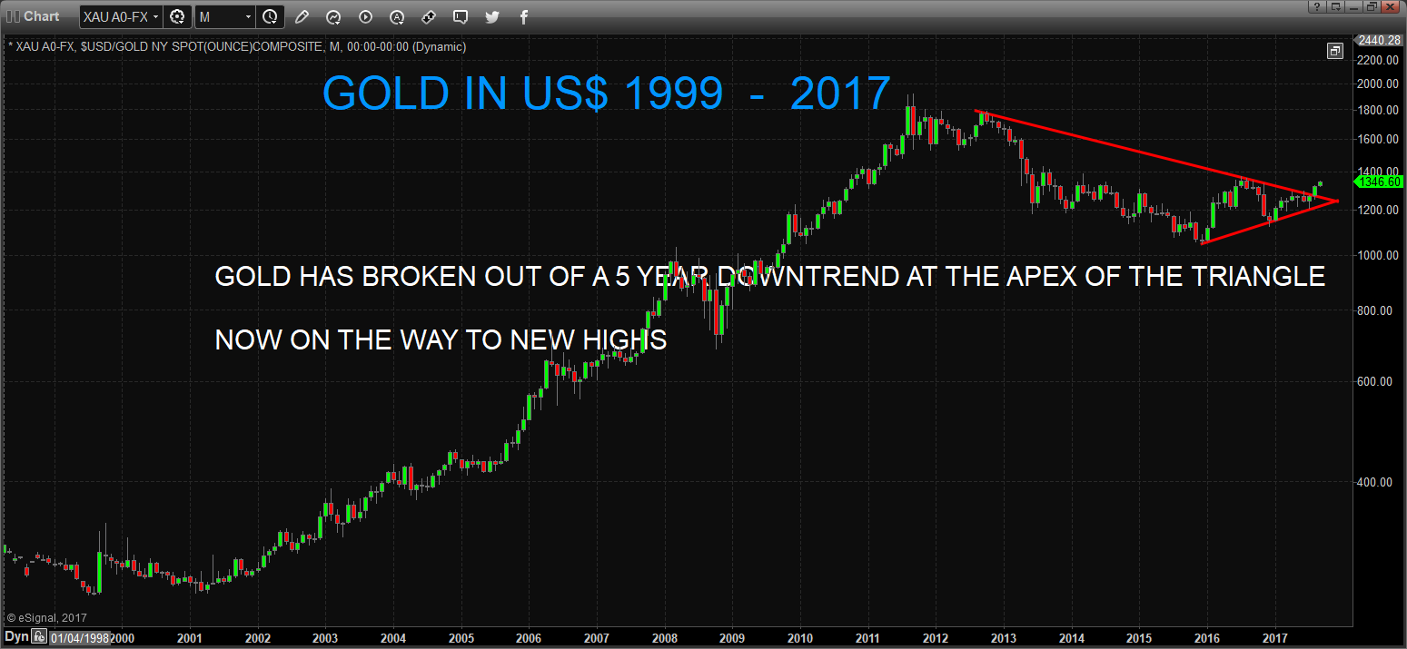 The autumn of 2017 has for some time looked precarious. The question is what catalyst will pop the bubbles in markets and the economy. Stocks look very vulnerable and overvalued on any criteria. Even though bubbles can always grow bigger, the risk is now unacceptable. At the same time, gold and silver have now finished the long consolidation period since 2013 and resumed the uptrend to new highs.