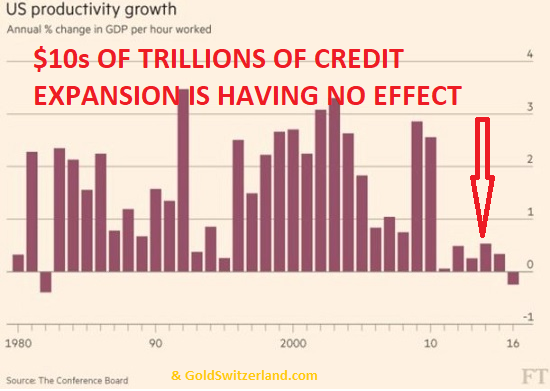 As the chart below shows, all the money printing and credit expansion is no longer having an effect. Even a child could understand that you can’t grow an economy by printing paper and calling it money but for some reasons, the Keynesians seem to ignore the obvious.