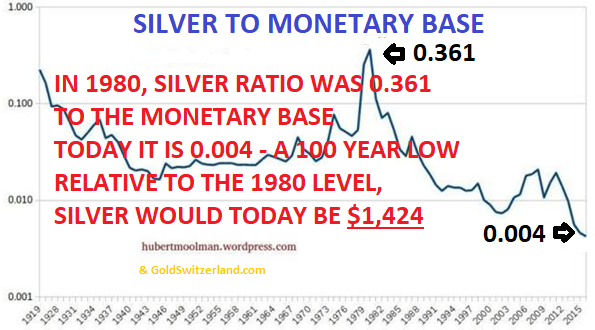 If silver today was at the same level against the US monetary base as at the 1980 peak, the price would be 80x greater at $1,424. Although this sounds like fantasy today, it is not unrealistic. Just look at what is happening to Bitcoin. And remember that silver is real money whilst Bitcoin is just an electronic construction with no underlying asset. This won’t stop Bitcoin to go much higher in a Tulip bulb type mania.