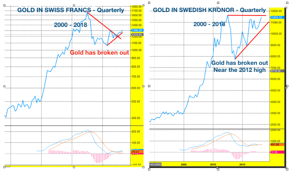 Just look at the charts below. Gold in Swiss francs has broken out and is in a clear uptrend to new highs. And gold in Swedish kronor is near the 2012 highs. So is gold in Canadian and Australian dollars. Gold in US dollars and other currencies will follow soon.