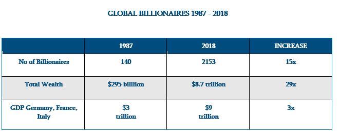 These 2153 global billionaires have a total wealth which is equal to the GDP of Germany, France and Italy combined with a population of 210 million. Even more significant is that the wealth of the world’s billionaires has grown 29x since 1987 whilst the combined GDP of Germany, France and Italy has only gone up 3x.