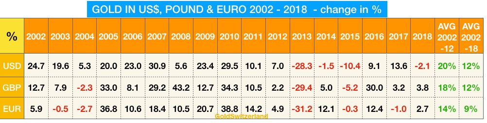 If we look at the whole period 2002-18, Gold in Dollars and Pounds have, in spite of a major correction, gained a very respectable annual 12% on average and also outperformed the Dow Jones and all global stock markets.