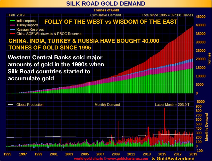 It was such an easy risk analysis and investment decision which makes it totally surprising that so few in the West saw it. At the same time as the West was selling gold, the East started to accumulate major amounts. The chart below shows the Folly of the West versus the Wisdom of the East.