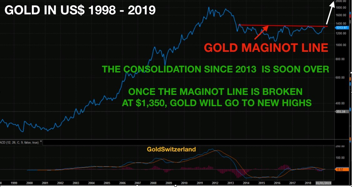 So the only short term method to predict gold’s next move is looking at gold’s technical picture. This tells us that gold is now in the finishing stages of a corrective move. Once the correction is over and gold breaks the Maginot Line at $1,350, we will see a quick move to $1,600. I would not be surprised to see gold making new highs in 2019 against the dollar, above $1,920. The next move up could start as soon as in the next 2-3 weeks. Possibly, but less likely is that the move starts August – September.
