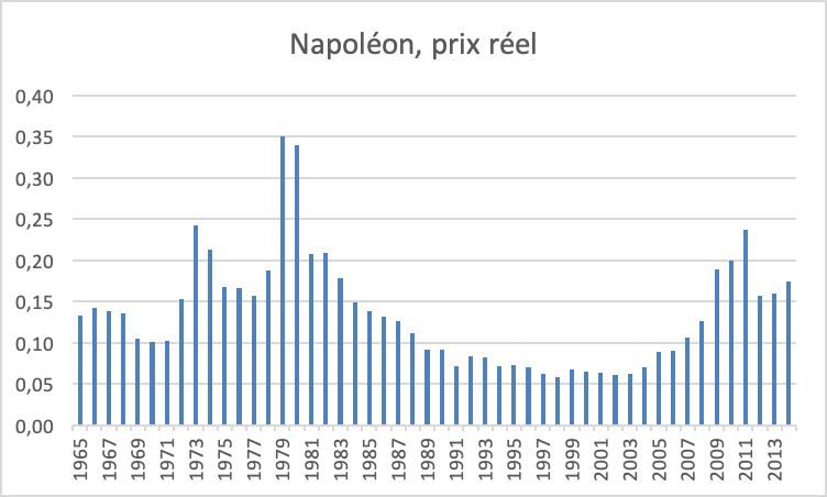 Among all the products researched (from vacuum cleaners to automobiles, from a bottle of Ricard to the cost of rent), of course, I haven’t forgotten the price of gold, using the Napoleon, the most popular gold coin in France.