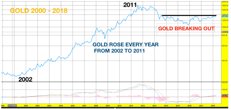 The timing was quite fortunate. As the chart below shows, gold rose every year from $300 in 2002 to $1,920 in 2011. In 2013 a bigger correction started which ended in 2015. Since then gold has only moved up slowly just like it did in 1999-2001.